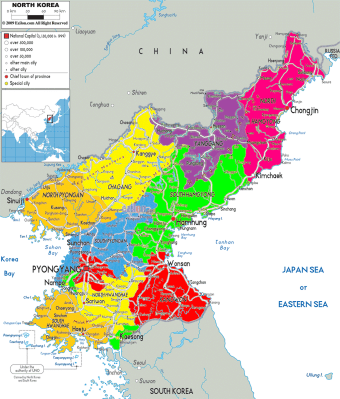 Notice how the state is divided up into provinces? Of course, in a nation like North Korea, these regions have no autonomy whatsoever, as everything is controlled by the central capital, Pyongyang, due to the communist ideology that influences North Korea’s philosophy on government.