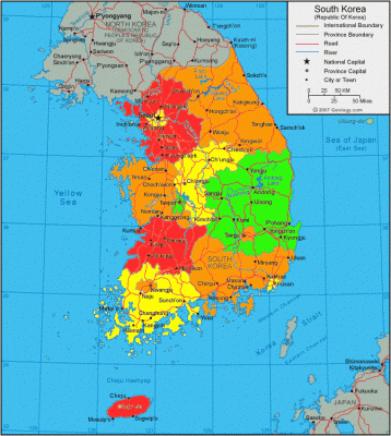 The South Korean state is largely divided up the same way as North Korea, but of course the South allows much more regional autonomy than does the North. This has not always been the case though, as the South Korean government was largely an authoritarian, right-wing proxy of the United States during the Cold War. Today, however, South Korea is a full-fledged democracy, has largely unfettered markets, and is considered to be a card-carrying member of the developed world.