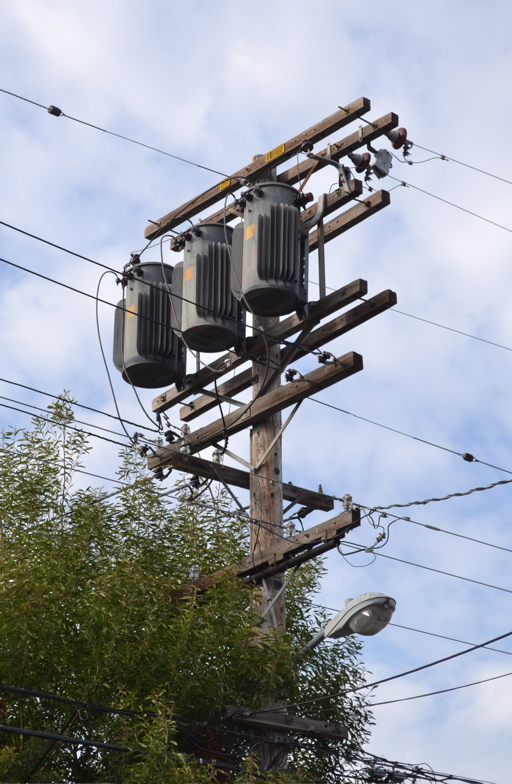 Ugly grey boxes? Not to me. Some anonymous engineers put their heart and soul into designing those transformers. The basic idea of a transformer has been known for years: use a pair of coils with different winding densities to convert electrical energy into magnetic energy and then back to electrical at a desired voltage. But to design a really good transformer requires careful attention to fabrication costs, reliability, safety, and operating efficiency. No transformer is perfect; some energy gets lost as waste heat, and heat must be dissipated even in the hottest weather lest temperatures exceed safe operating levels. (Notice the cooling fins on each transformer.) The fluid bath which enhances efficiency must never leak – or more precisely, the probability of leakage must be kept extremely low. Nice job, guys (maybe gals, too). Thanks!
