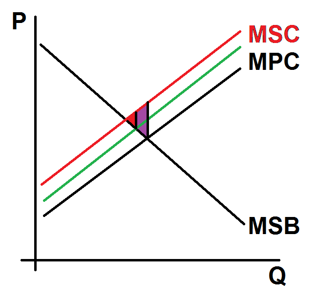 In this market, we end up with an equilibrium quantity defined by the point where Marginal Private Cost equals Marginal Social Benefit (MPC = MSB). But the Marginal Social Cost (MSC) is greater, so we get a deadweight loss equal to the triangle I’ve shaded in red and purple.