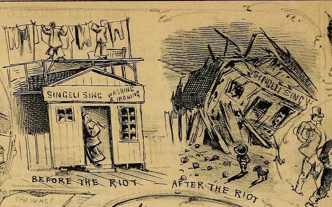 An illustration of the time, echoing the 3-day pogrom vs Chinese immigrants, San Francisco Jul. 1877 – Source
